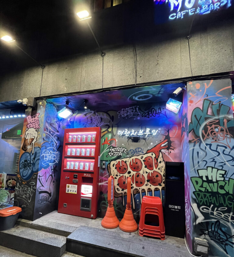 入口の自販機コンセプトのドアーを開けて店内に入るとカラフルなグラフィティアートと照明のインテリアという個性のあるお店。6種類のチーズが入っているデトロイトピザ、