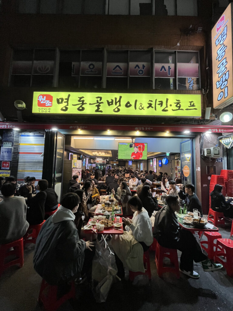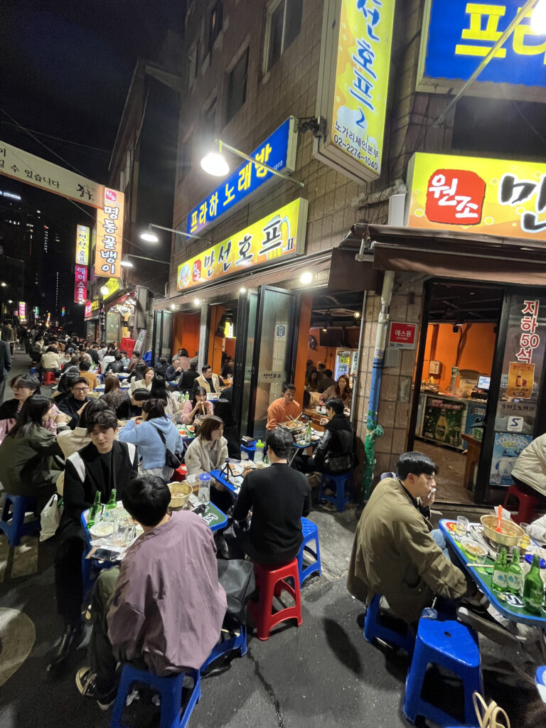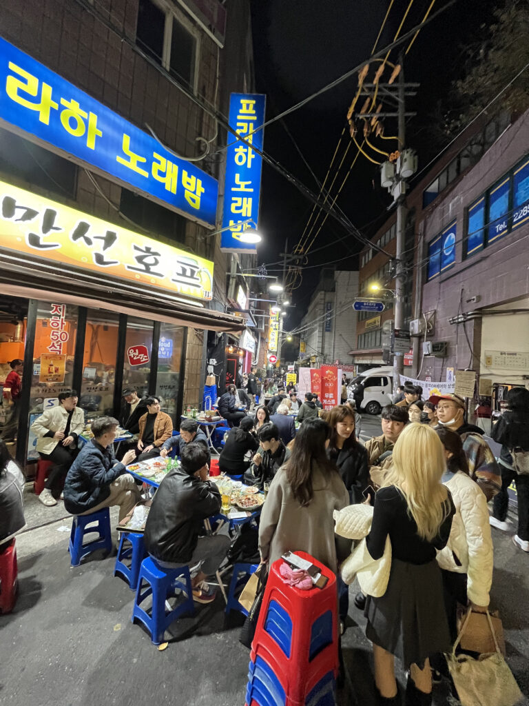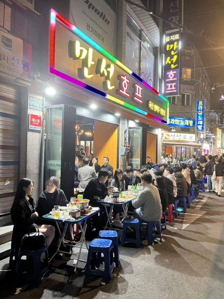 乙支路3街駅の路地裏では毎日が路上ビール祭り。ノガリ(スケトウダラ干物)メニューが当たり前でビールと相性抜群。