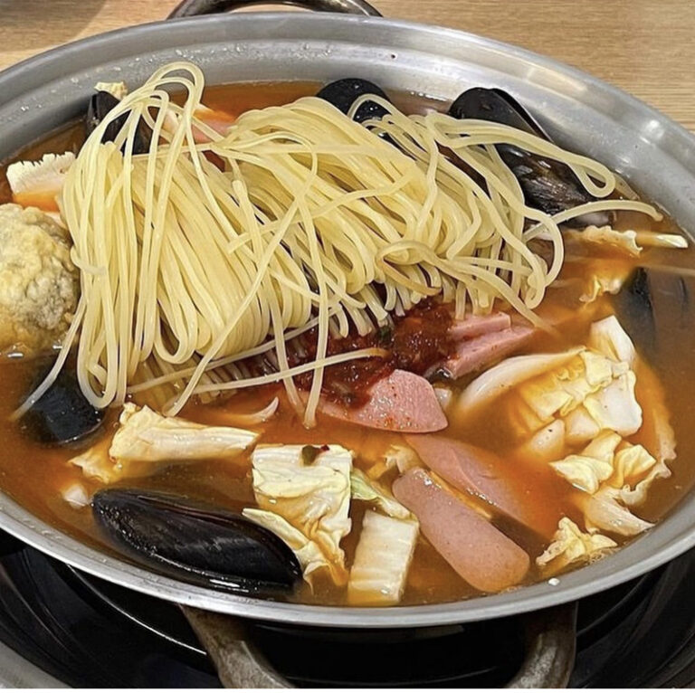 店内のグループの上で、鍋にチーズトッポギ、海鮮トッポギ、プルコギトッポギなどそれぞれ注文したメニューに麺やおでん、マンドゥ、チーズなど好みのトッピングをしてぐつぐつとその場で作る即席トッポギ