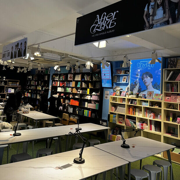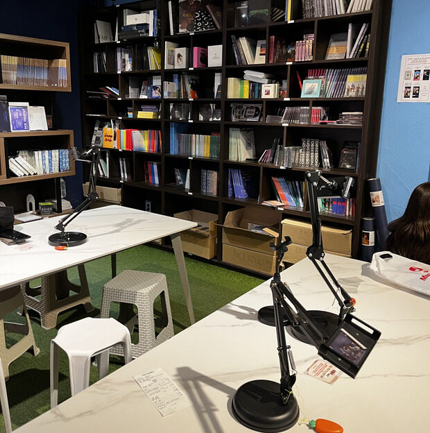 店内には韓国で流行りの「アルバムカン앨범깡」のためのテーブルとスマホ台が用意しているのが特徴のお店で、アイドルアルバムCDに入っているアイドルのフォトカードを収集するファンたちが増え、その場で購入したアルバムCDを開封してフォトカードを楽しみながら撮影ができるK-POPアルバムCDの専門ショップ。