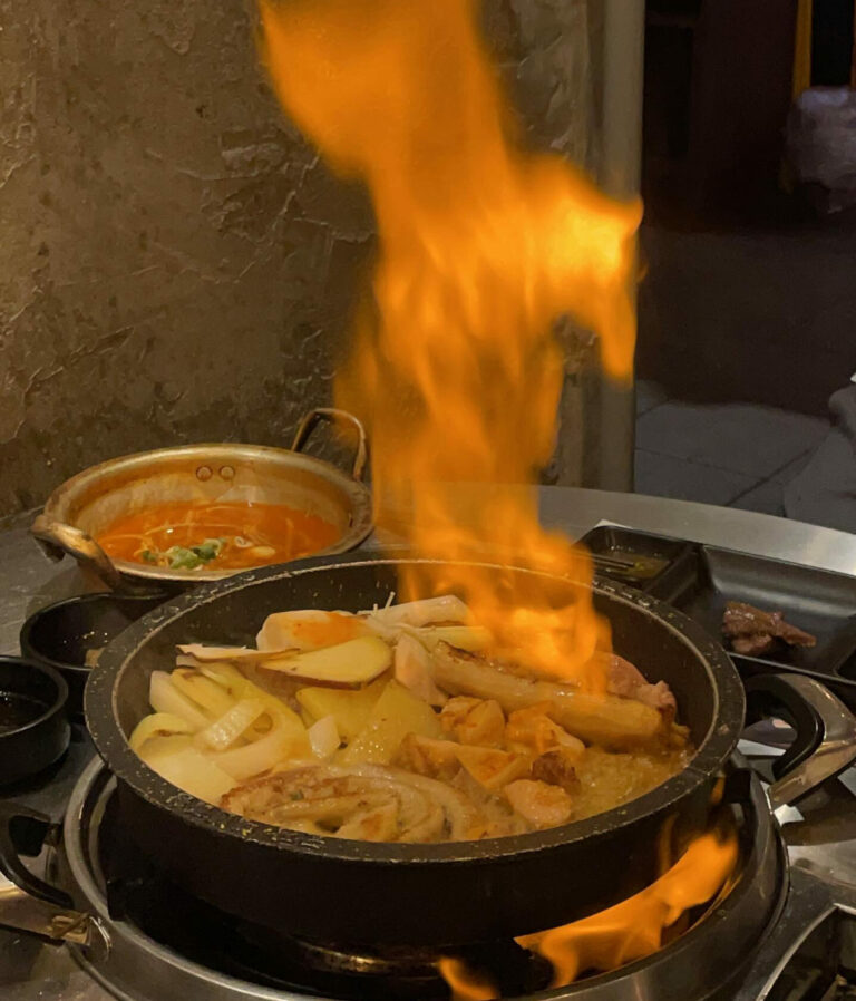テハンコプチャンでは、洗練されたスタッフさんが油をかけてファイヤーショーから最後まで程度良く焼いてくれるので、美味しく食べるだけ!