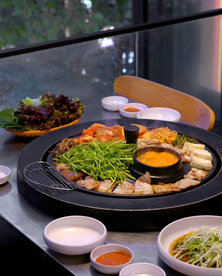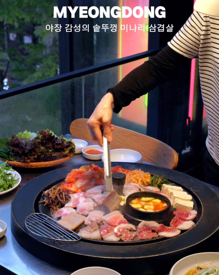 このミナリサムギョプサルを韓国ではサムギョプサル焼き鉄板には最高と呼ばれている鉄窯の蓋に焼いて、本格的な焼肉が味わえるのがこちらチョンハチェイルソットゥコン明洞店。