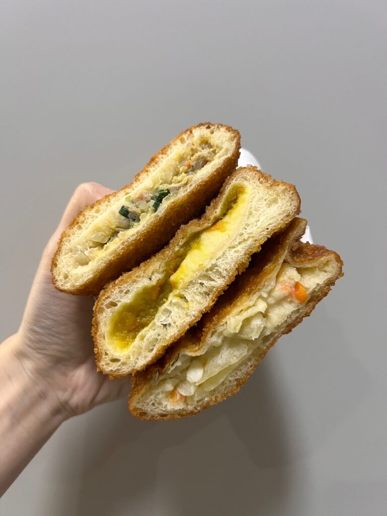 さつまいもカレーは、カレー部分にはカレーと共に細いにんじんや玉ねぎ等少し野菜も入っていました。日本のカレーパンよりもさつまいもが入っているので、さつまいもの旨味や甘さが引き立つお味です🍠